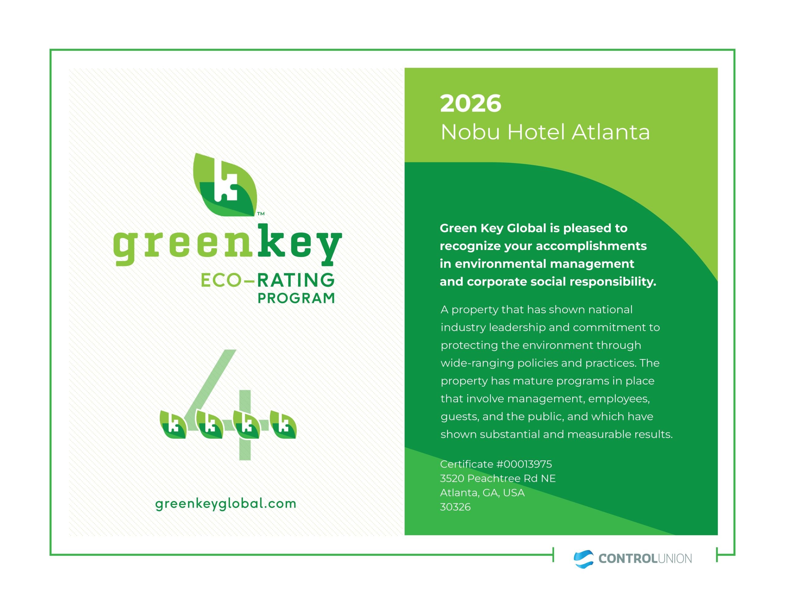 At Nobu Hotel Atlanta, sustainability is woven into every aspect of the guest experience. We are proud to have been awarded the Green Key Certification – 4 Keys, recognizing our commitment to environmentally responsible practices and operational excellence. Guided by three core pillars—Environment, People, and Prosperity—we are dedicated to minimizing our environmental footprint, supporting our team, and creating long-term value for our community and future generations.