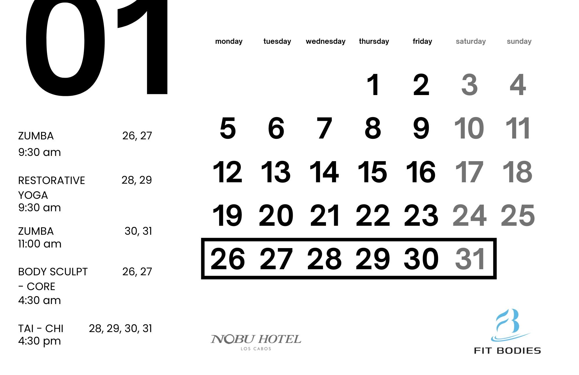 Tu reinicio mensual: una semana inspiradora a la vez. Cada mes, un especialista destacado en fitness te trae un programa de experiencias de movimiento cuidadosamente seleccionado, diseñado para energizar el cuerpo y despejar la mente. Únete a una semana de entrenamiento intencional, flujo consciente y un impulso para sentirte bien, en el tranquilo ritmo de Nobu, donde el bienestar es tan elevado como el entorno.