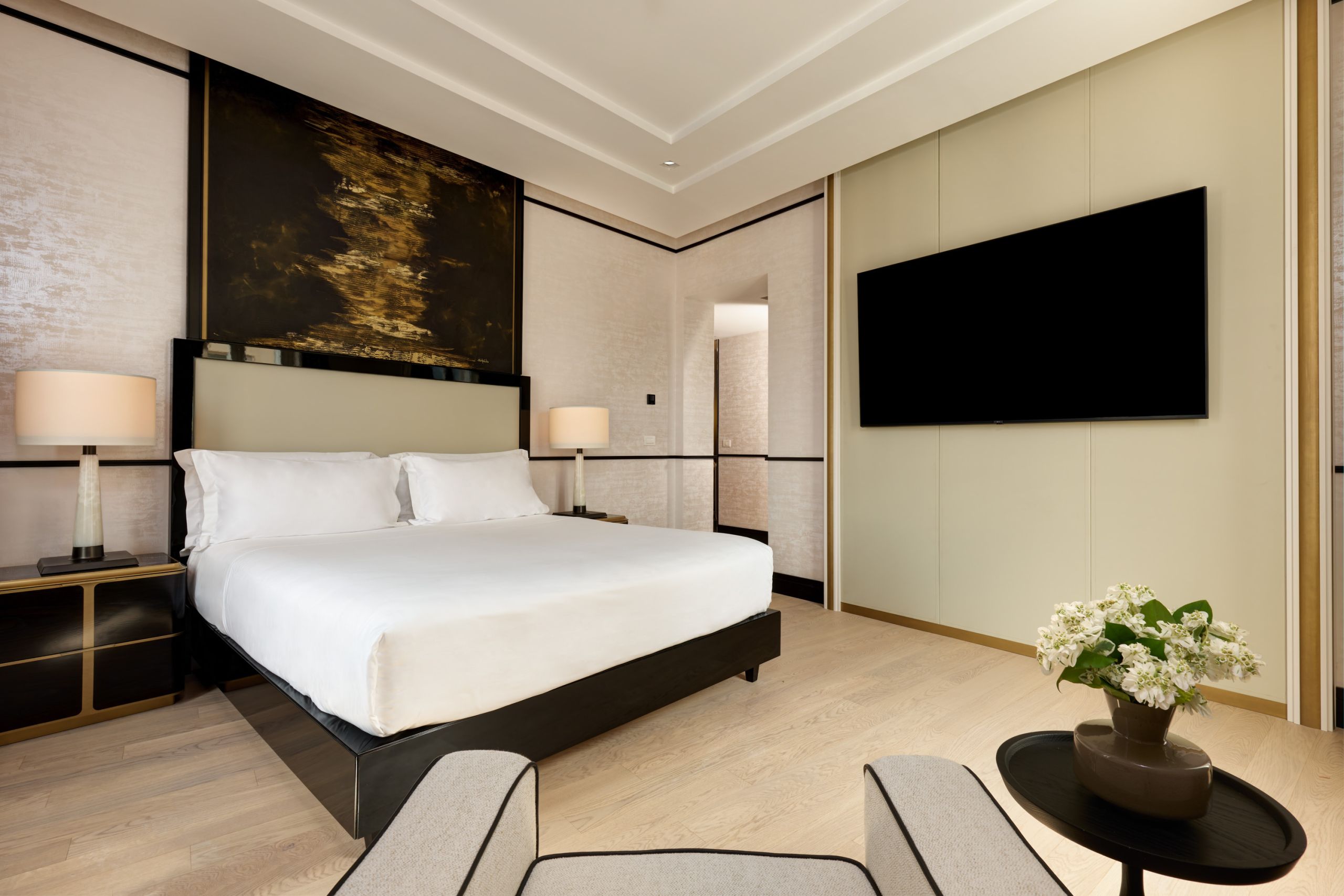 A refined expression of Japanese-inspired elegance, the Sakura Suite offers a serene retreat where sophistication meets comfort. Located in the heart of Via Veneto, the Suite offers stunning views of the iconic street, with balcony options available upon request. The layout is thoughtfully designed, featuring a peaceful sleeping area and a separate lounge complete with plush armchairs and sofas.